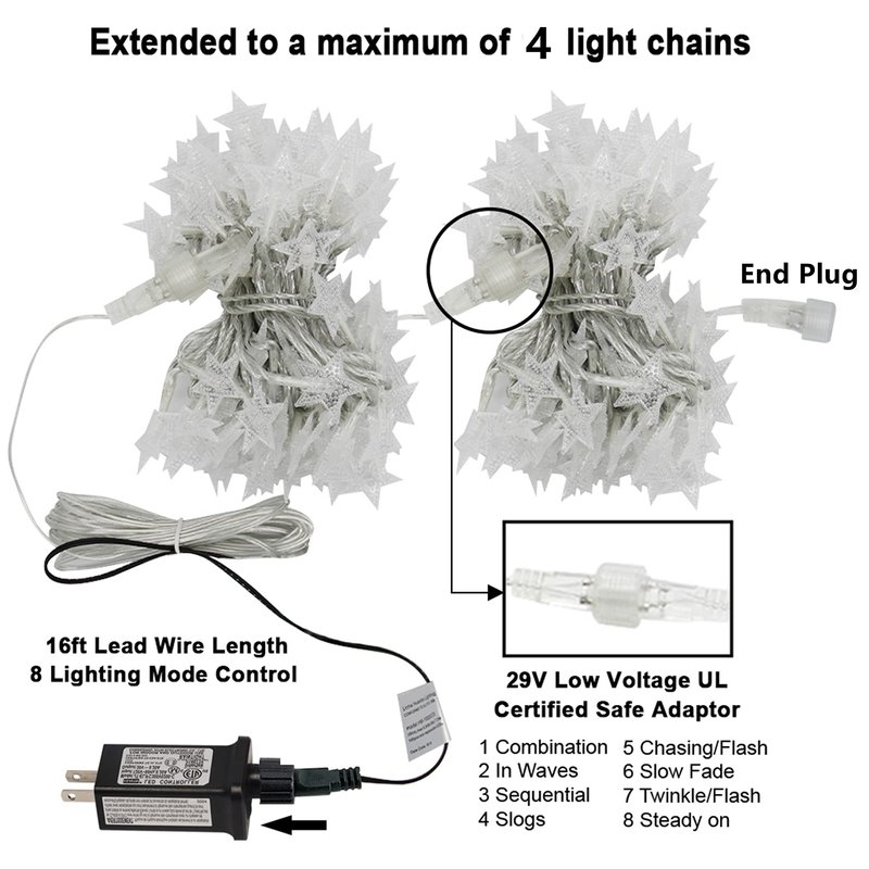 - Extendable- LED Star String Lights with Male and Female Safe Plug, could be extended to a maximum of 10 light chains, from 49.2 ft to 344.5 ft (maximum 1000 LED). Please note that the transformer is IP 44 waterproof, so it can meet normal use outside but not enough to put under water directly.