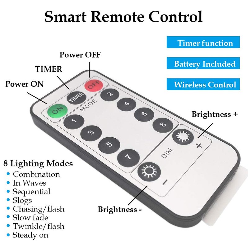 - USB-Powered and Remote Control: Directly plug in/unplug it for power on/off and you can press the button on the USB to adjust 8 modes setting. And you can easily turn on/off the lights through the remote.