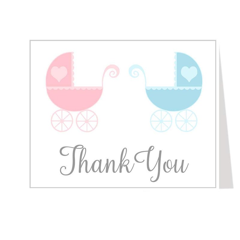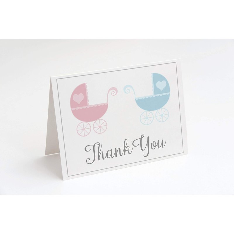 Twins Baby Shower Thank You Cards Gender Reveal Thank You Notes Thank You Cards Shower Lovely Carriages Twins White Pink Blue Grey Gray Stroller Twins (24 Count)