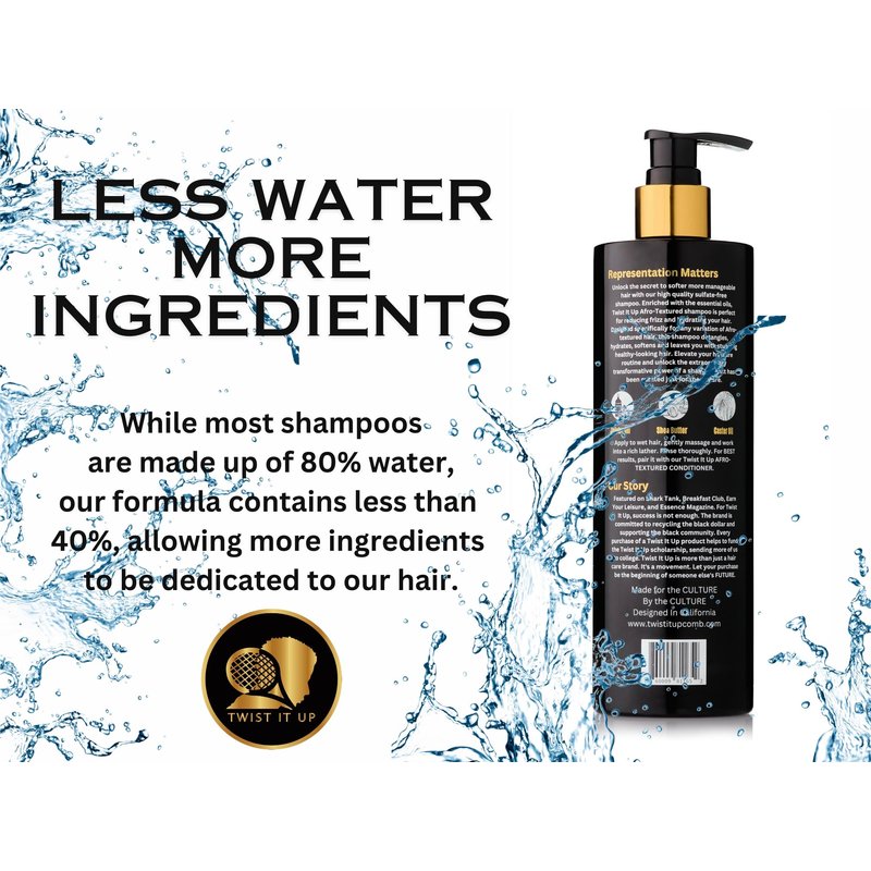 The New Gold Standard for Afro-Textured Hair. Formulated with over 20 essential ingredients, unlock the secret to softer more manageable hair with our high quality sulfate-free shampoo. While most shampoos are made up of 80% water, our formula contains less than 40%, allowing more ingredients to be dedicated to our hair. Enriched with the essential oils, Twist It Up Afro-Textured shampoo is perfect for reducing frizz and hydrating your hair. Designed specifically for any variation of Afro-textured hair, this shampoo detangles, hydrates, softens and leaves you with stunning healthy-looking hair. Elevate your haircare routine and unlock the extraordinary transformative power of a shampoo that has been curated just for the culture.