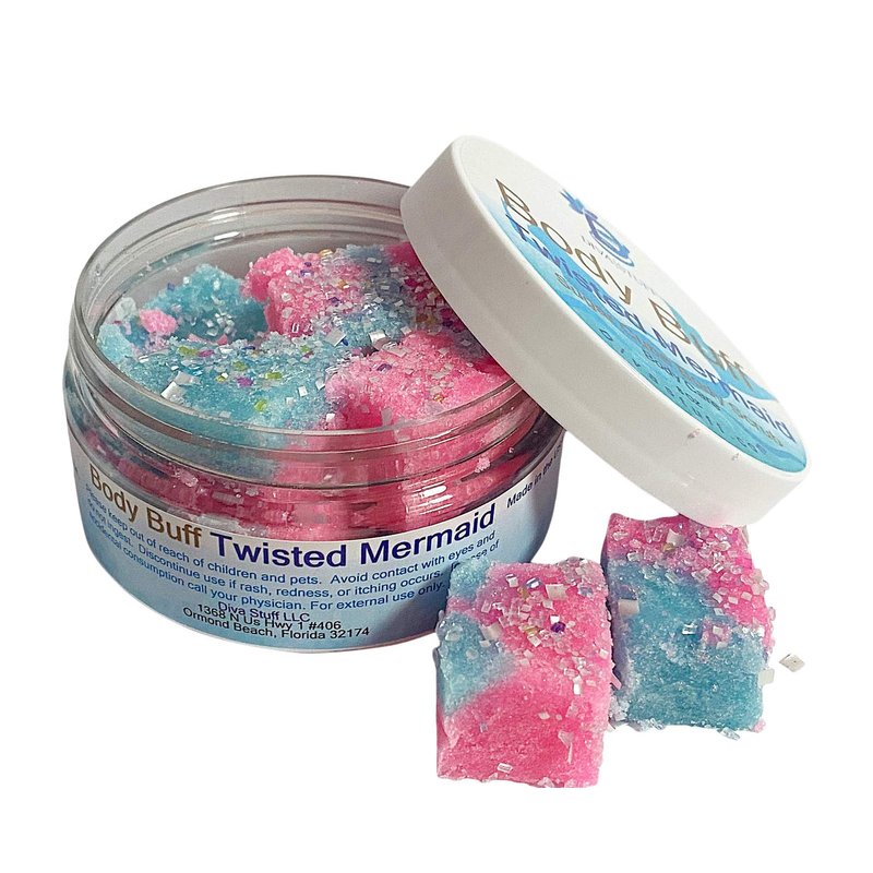 Twisted Mermaid Scent is a totally yummy, scrumptious combination of berries and citrus with sugary sweetness and hints of vanilla in the bottom notes. Refreshing! Our scrubs are made with the finest ingredients and are easy to use. Take one cube out of the jar and moisten under water in the shower. Apply using your hands to arms, legs and torso massaging in a circular motion, rinse clean. Sugar is a natural humectant so it will help exfoliate dead skin but also draw in moisture from the air keeping skin soft and hydrated. May be used on elbows, knees, heels and more. Our Twisted Mermaid Scent is colorful and fun. It has a little does of iridescent sugar crystals on top. These crystals will dissolve while using. This comes in an 8 oz jar.