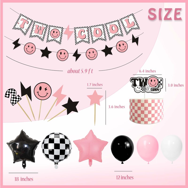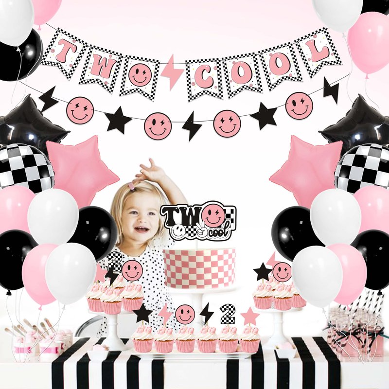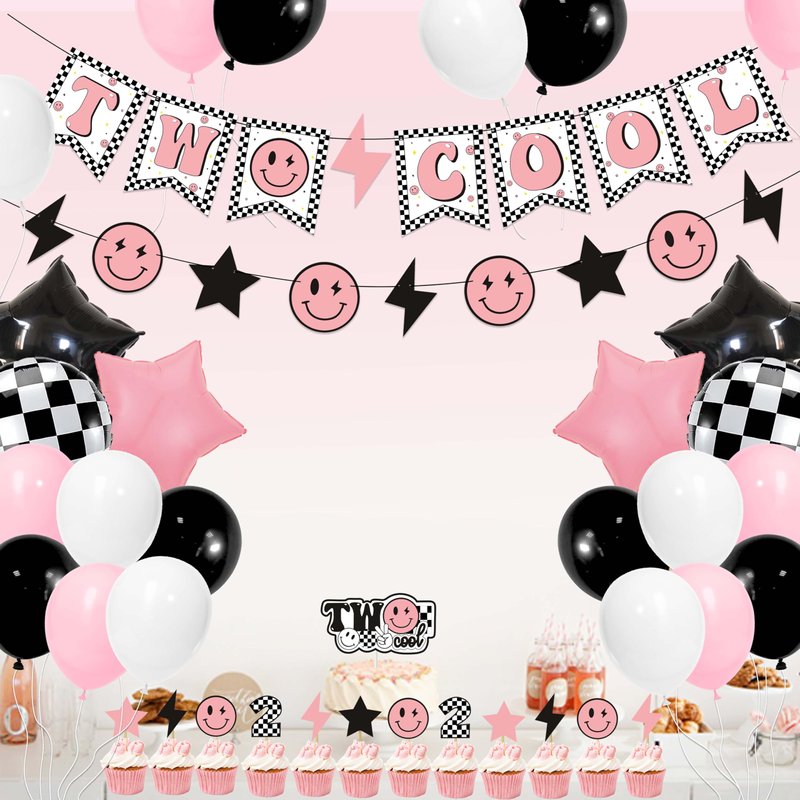 Two Cool Dude Pink Smile-Theme Birthday Party Decoration Set, Two Cool Girl Second Birthday Banner Cake Toppers Pink White Black Checker Balloons for Two Happy Face Party Supplies