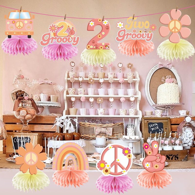 Two Groovy Party Decorations Table Honeycomb Centerpieces for Girls, 9 Pcs Groovy Birthday Theme Table Topper Party Supplies, 60s Retro Hippie Boho Party Decor 2nd Birthday Supplies