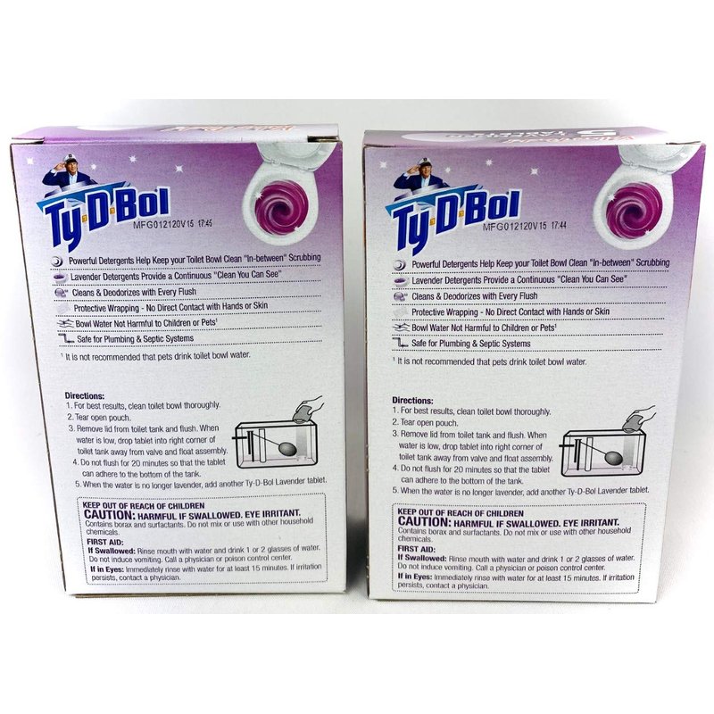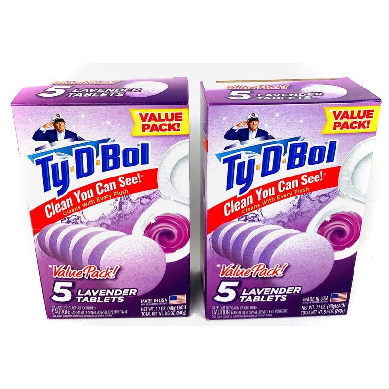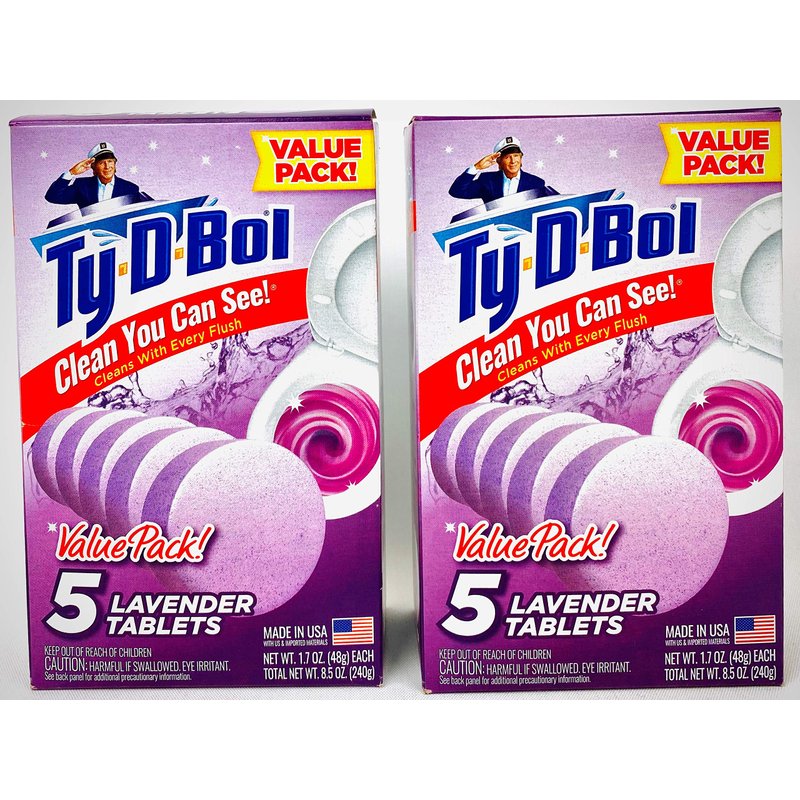 Ty D Bol Toilet Cleaning Tablets with Continuous Clean With Lavender color to deodorize your Toilets for a Fresh Smelling Bathroom 10 tabs (2-5 count packs)