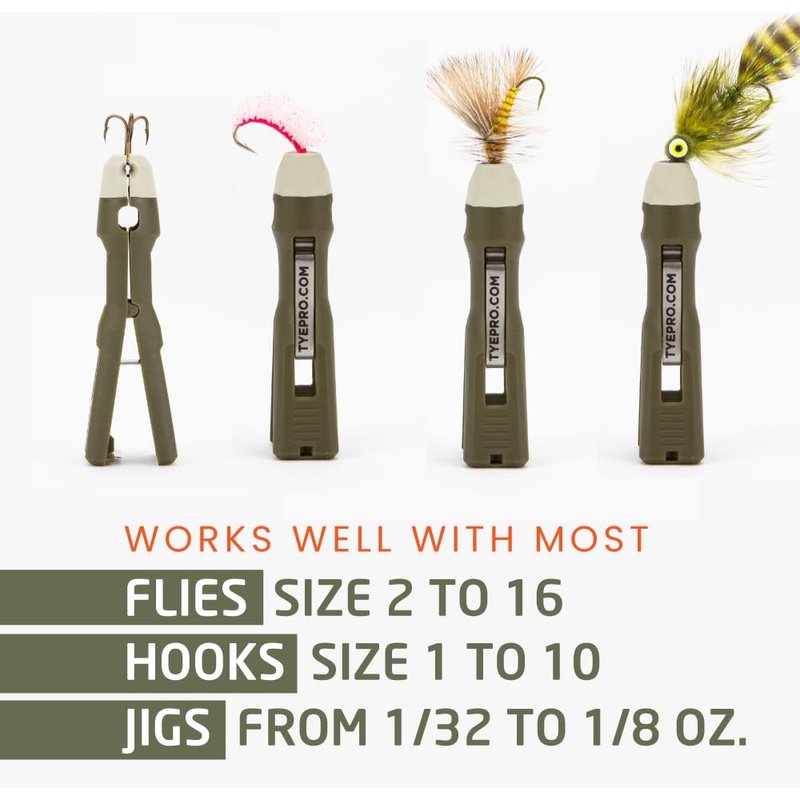 - The TYEPRO Fly and Ice Tying Tool is the perfect companion for avid fly fishing and ice fishing enthusiasts. Engineered to perfection, this tool is tailor-made to meet the needs of both types of anglers. It effortlessly accommodates a wide range of flies and ice jigs, supporting line and tippet sizes from 0.020" down to 0.003". Experience seamless and efficient tying with the TYEPRO Fly and Ice Tying Tool, your go-to tool for precision and convenience on the water made and designed in the USA.
