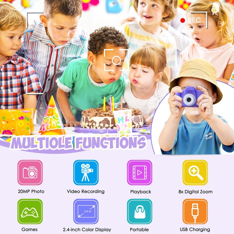 - New kids toy camera- Kids digital camera with 1080P HD, 2.0 inch IPS screen with autofocus and 8x digital zoom. Children can take photos with frames, leave some hilarious photos with family or friends. Catch the wonderful joy moment for boys or girls