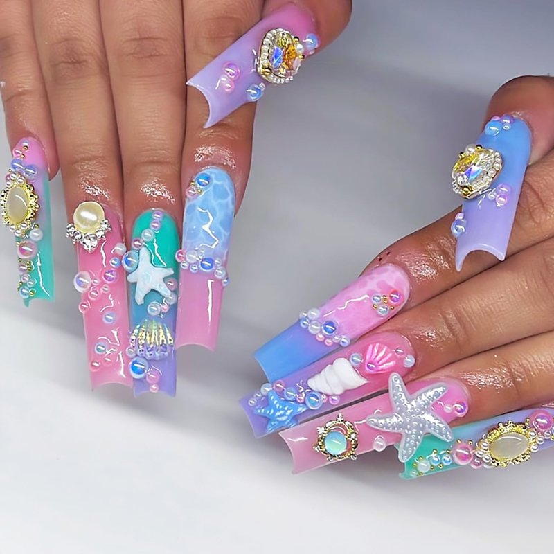 Tyuimhx Ocean Theme Press on Nails Square Long Fake Nails Summer Luxurious False Nails With 3D Starfish Seashells Rhinestones Pearls Designs Full Cover Stick on Nails Acrylic Artificial Nails 24Pcs