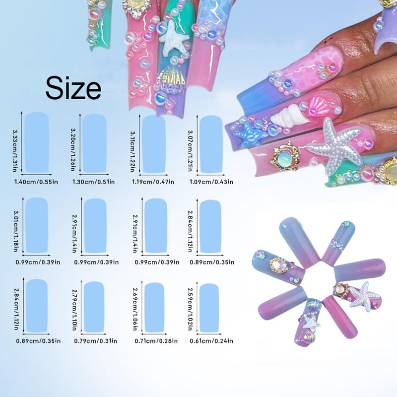 - 【Ocean Theme Glue on Nails Kit】: There are 24pcs of long square artificial finger nails 12different sizes, 1 mini nail file, 1 small wooden stick, 1 nail sticker in the package.(Jelly glue doesn't last as long as liquid glue, but it can make fake nails reusable. Please use suitable glue according to different occasions).