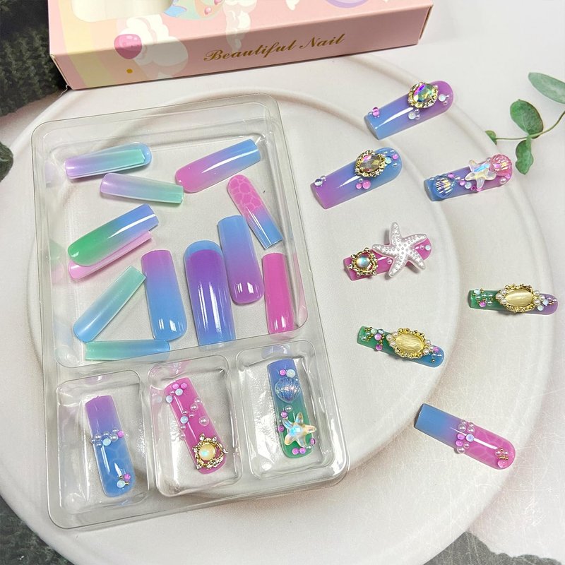 - 【Easy to Use】: Choose the suitable ocean theme fake nails, polish the nail bed, paste the jelly glue we give you, press the fashion nail art in 30 seconds, and create the nail art that girls like,If the size is not suitable, it can be polished to the size of the nail cap with a friction tool.