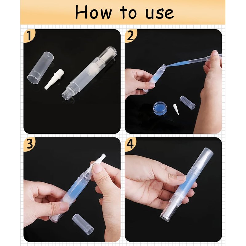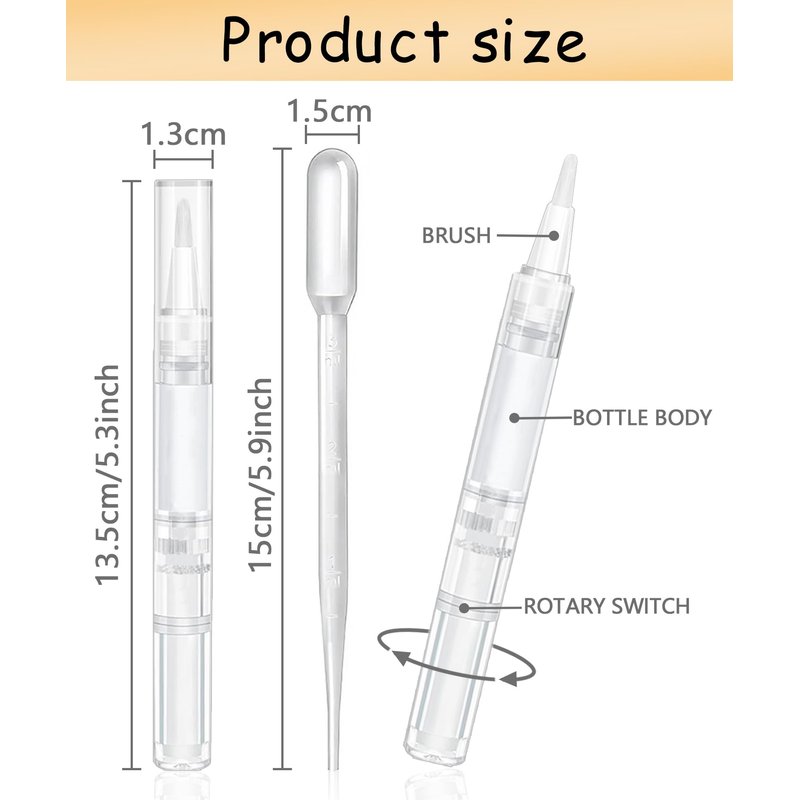 - VERSATILE DISPENSE PENS - Each pen has a 3ml capacity and can be filled with cuticle oil, nail polish, jojoba oil, eyelash serum, lip gloss, teeth whitening gel, essential oils, foundation, serums, and more. It can also serve as a touch-up pen for latex paint (not suitable for high-acid or high-alcohol content liquids)