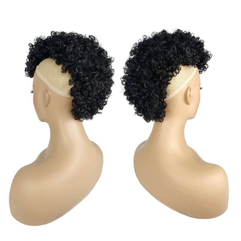 UAmy hair Afro Puff Mohawk Ponytail Jerry Curly Non Drawstring Ponytail Clip in Synthetic Fauxhawks Afro Puff Bun with Bangs Short Afro Kinky Curly Hair Bun Warp Hair Extensions with 6 BB Clips 1B