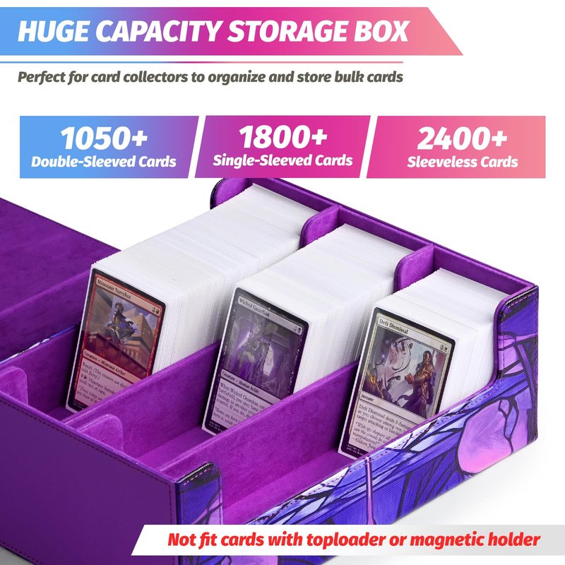 - Super Large Capacity - The card storage box can easily accommodate over 2400 loose trading cards. It is also suitable for storing 1050+ double-sleeved cards or 1800+ single-sleeved cards, but not compatible with cards in top-loaders or cards held by magnetic card holders. Accessory: 6Pcs card dividers