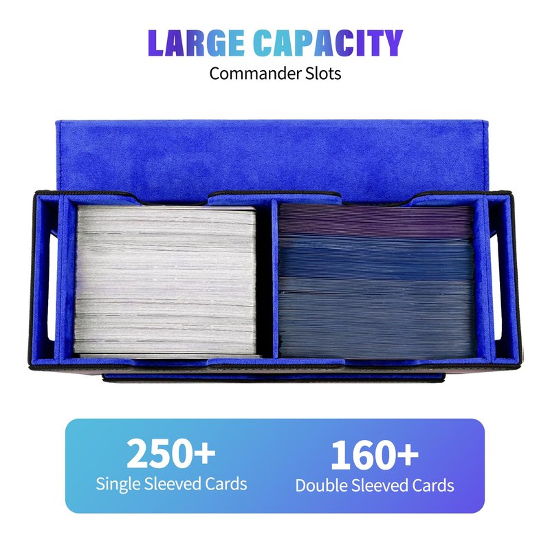 - Ample Capacity: tested with various popular card sleeves, the upgraded commander card case boasts an impressive capacity. It fits 250+ single-sleeved cards. The spacious dice tray design helps you to store your dice, ensuring all your gaming essentials are neatly organized and within reach