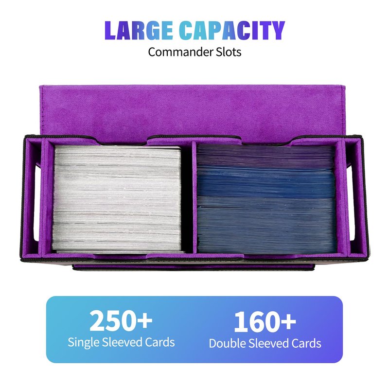 - Ample Capacity: tested with various popular card sleeves, the upgraded commander card case boasts an impressive capacity. It fits 250+ single-sleeved cards. The spacious dice tray design helps you to store your dice, ensuring all your gaming essentials are neatly organized and within reach