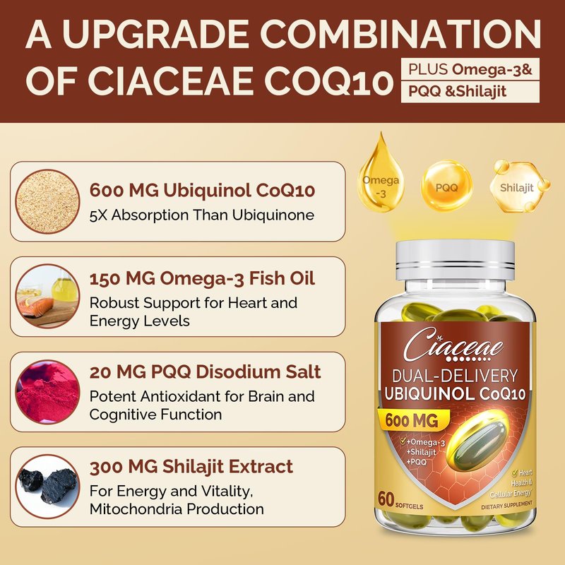 - OMEGA-3 & PQQ FOR HEART AND BRAIN: As we age, our body's natural production of Co-q 10 diminishes, which can affect the heart and brain function. Ciaceae CoQ10 Nutritional Supplements added an extra 150mg Omega-3, 20mg PQQ per serving. Ubiquinol, the most absorbable form of CoQ 10, is combined with Omega-3's antioxidant properties, and is good for the heart and maintaining natural CoQ10 levels; CoQ10 with PQQ provides a powerful tool for brain function, benefiting the body's immunity and memory.
