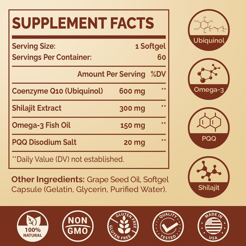 3. Unique formulation: CoQ10 600 mg plus Omega-3 150 mg, PQQ 20 mg, and Shilajit Extract 300 mg. These ingredients in combination with Ubiquinol CoQ10 and Omega-3 Fish Oil, provide a comprehensive support system for heart, brain, and cellular energy production.