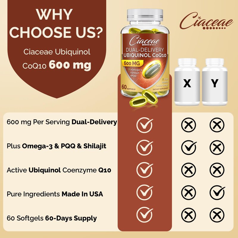 1. High Dose 600mg Ubiquinol CoQ10: Each softgel is 600mg pure Coenzyme Q10, not others' coq10 100mg, coq10 200mg, coq10 300mg or coq10 400mg.