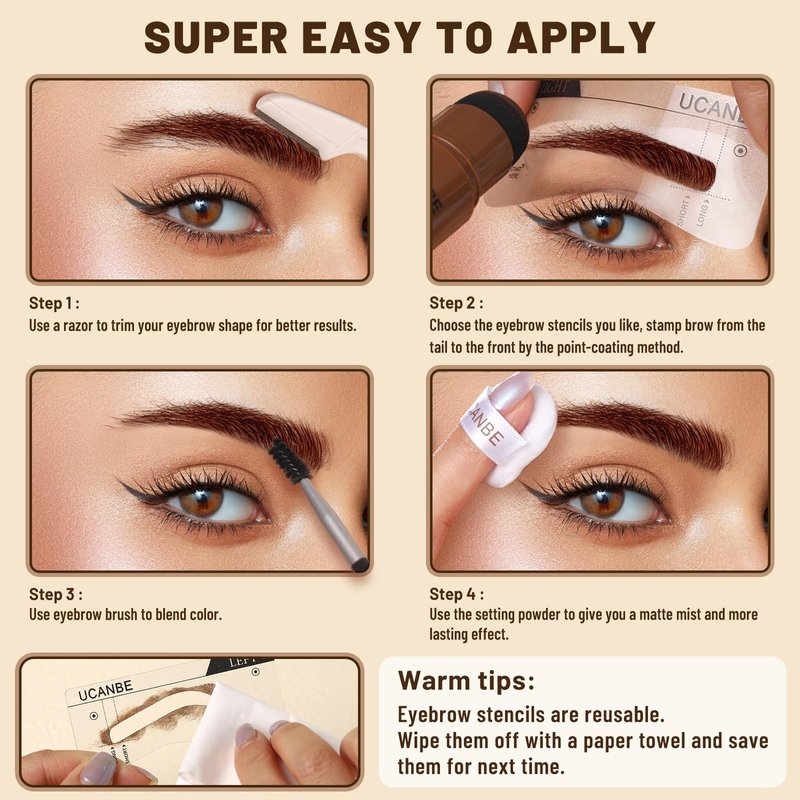 - For Thin & Thick Eyebrows: Well-chosen 10 pairs reusable eyebrow stencils follow the golden ratio principle to provide a range of shapes that perfectly fit all types of eyebrows. Whether you're looking for a natural or a bold eyebrow makeup look, UCANBE brow stamp kit has you covered!
