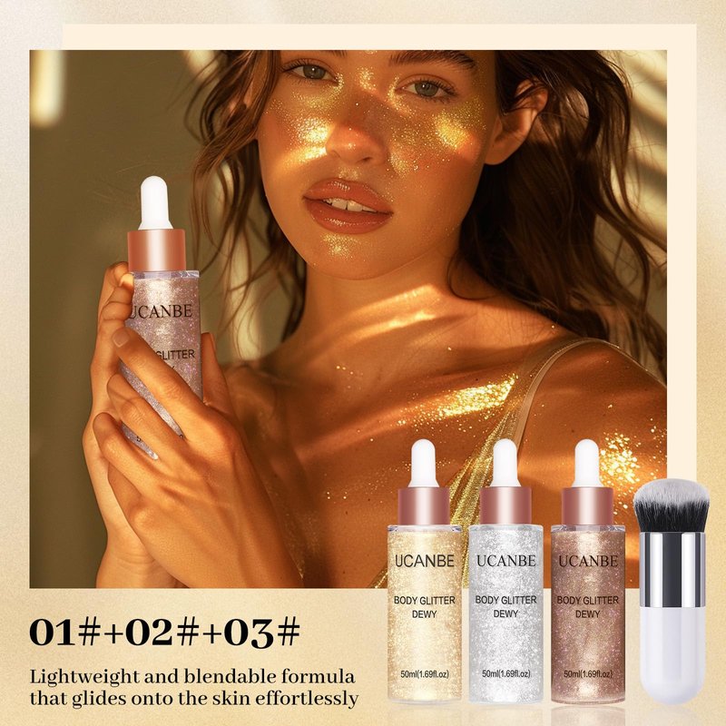 UCANBE 3 Pcs Face Body Glitter Liquid Highlighter Illuminator Dewy Drops with Makeup Brush, Makeup Sparkle Shine Luminizer Enhancer Body Shimmer Tint 50ml/1.69oz x 3 (3Pcs, Standard)