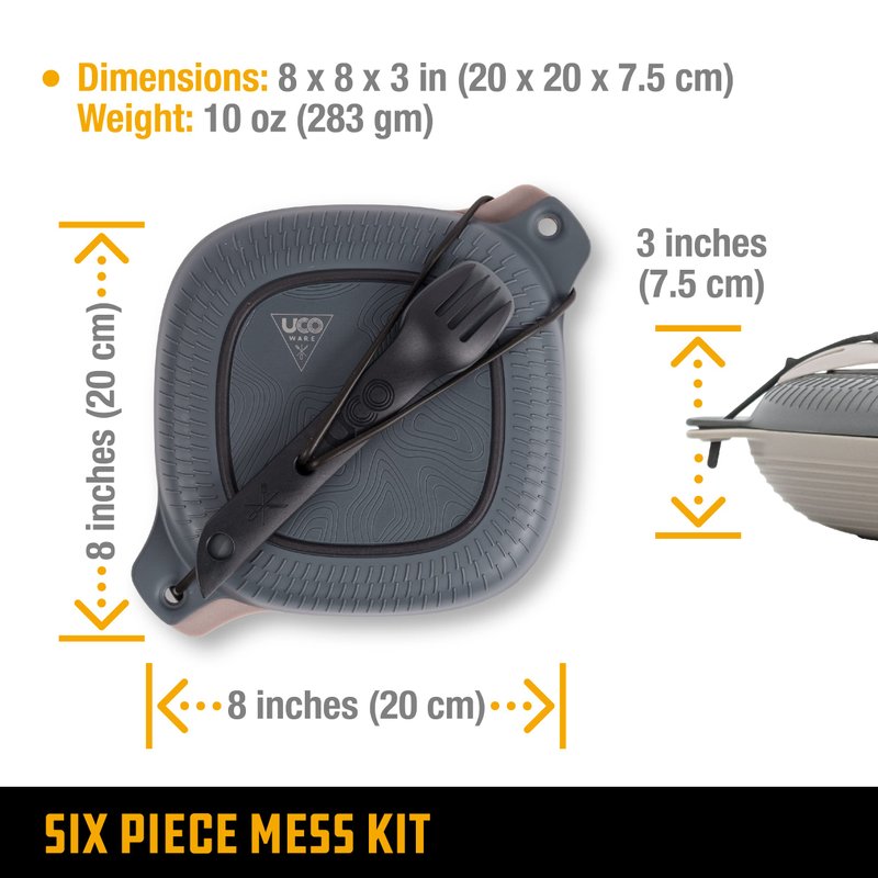- Mess kit measures 8 x 8 x 3 inches, weighs 0. 6 pounds; BPA- and phthalate-free, dishwasher and microwave-safe