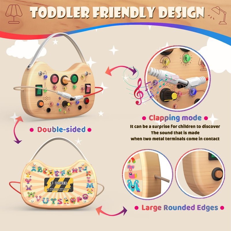 - 【Portable & Double sided】Our Montessori Busy Board has a leather handle and is a very easy toy to carry outdoors, indoors or while traveling by car and plane! The LED light switch busy board is very lightweight and is designed in the shape of a stylish bag. This switch board for toddlers 1-3 years old has different colours of LED lights and different types of switches on one side and 26 very cute letters on the other side.
