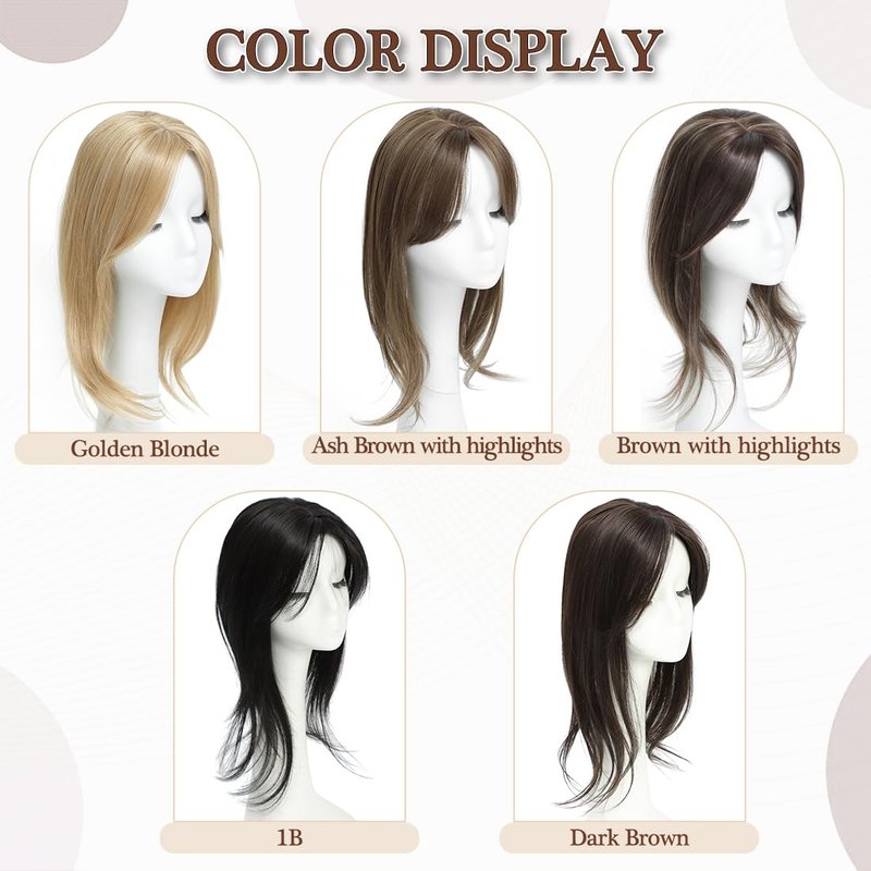 - 1. Hair Material: The hair toppers for women is made of high quality synthetic fibres just feel like human hair. High grade matte fiber with natural luster, washable, silky soft. The color is natural-looking with a matte finish and is not overly shiny.