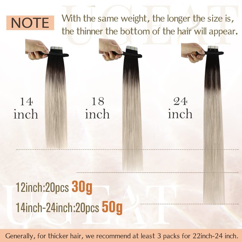 - 【Specifications】Each package of Ugeat Tape in Hair Extensions contains 20 pieces, with each piece weighing between 1.5-2.5g. The length of the extensions ranges from 14-24 inches, allowing you to choose the perfect length for your desired hairstyle.