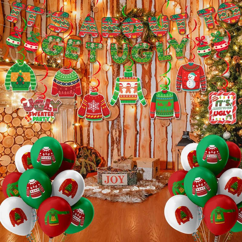 - 🎅Suitable for Christmas Ugly Sweater Theme Party Decorations: Ugly sweater banners and balloons party decorations are perfect for Merry Christmas decorations, Christmas party supplies, Christmas day decorations, Elf Christmas decorations, New Year's Eve party supplies and more
