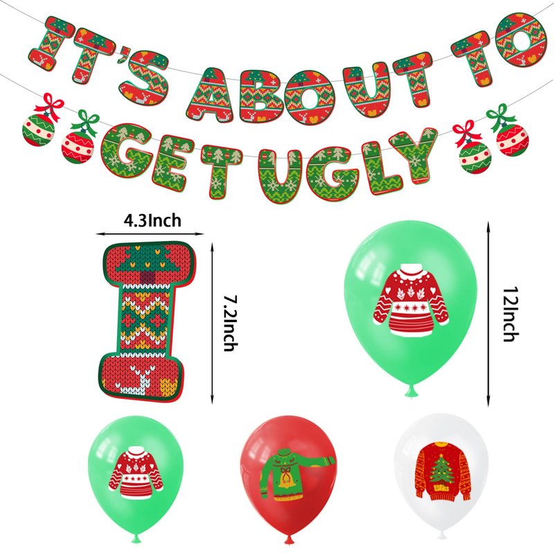 - 🎅Abundant Ugly Sweater Party Decor: you will get 1pcs It's About To Get Ugly Banner,8pcs ugly sweater hanging swirls, 18 pcs ugly sweater latex balloons for satisfying your needs of festival or daily use