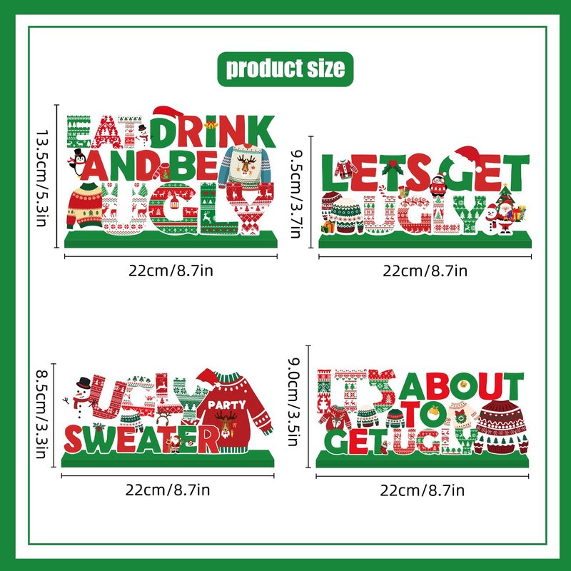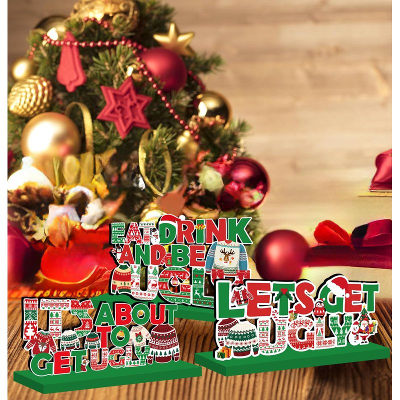 - Unique Design: This ugly sweater party supplies are printed with a variety of ugly sweaters, featuring the red and green colors that symbolize Christmas, as well as a variety of classic Christmas elements. Each ugly sweater party supplies wooden centerpiece contains the words 'Ugly sweater', 'It's about to get ugly', ' Lets get ugly' and 'Eat drink and be ugly', perfectly reflecting the ugly sweater party theme.