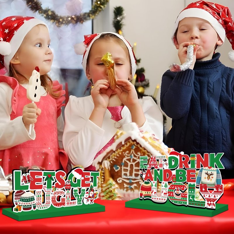 Ugly Sweater Party Supplies Christmas Wooden Table Centerpieces Cute Ugly Sweater Themed Christmas Party Decorations Green and Red Merry Christmas Wooden Sign with Elements of Ugly Sweater Pattern