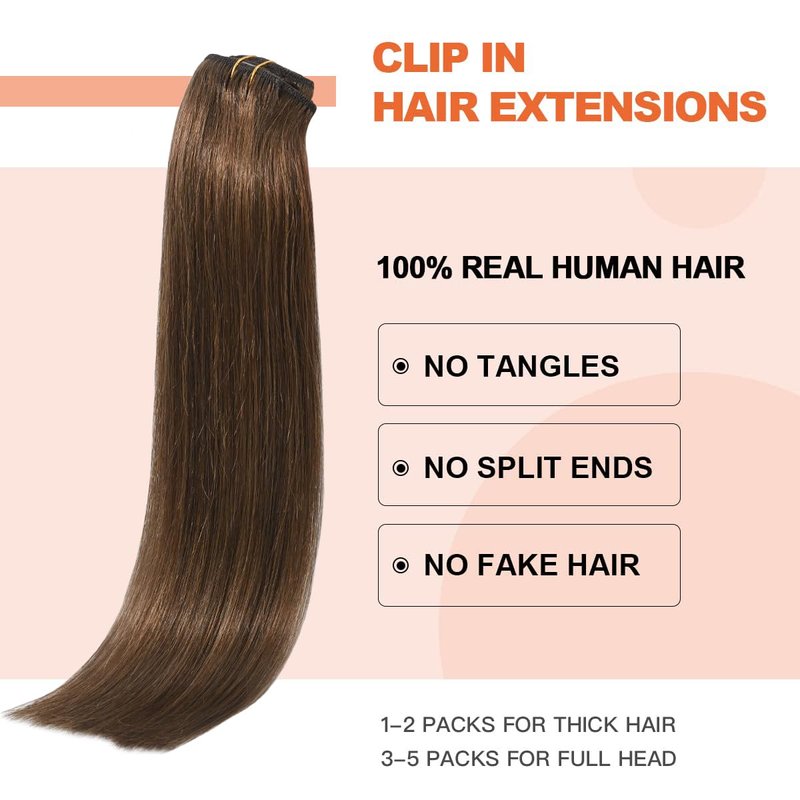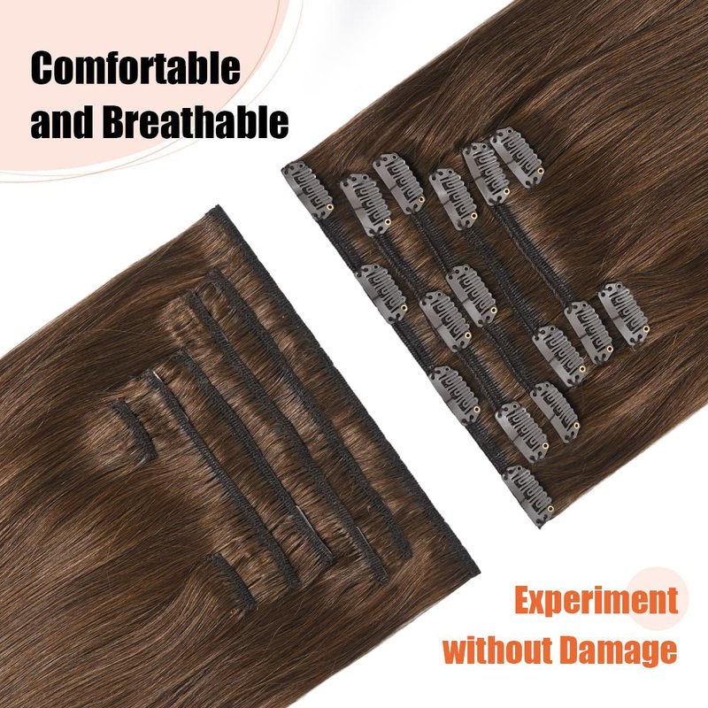 - 【Clip In Hair Extensions Material Quality】8A grade human hair, We guarantee this is 100% real human extensions. hair extension is soft like your own natural hair. clip in hair extension is no tangling, no shedding. Discreet silicon-backed clips are strong, hidden & lightweight. Designed to protect your natural hair and ensure your hair sits naturally when wearing our clip-in hair extensions.