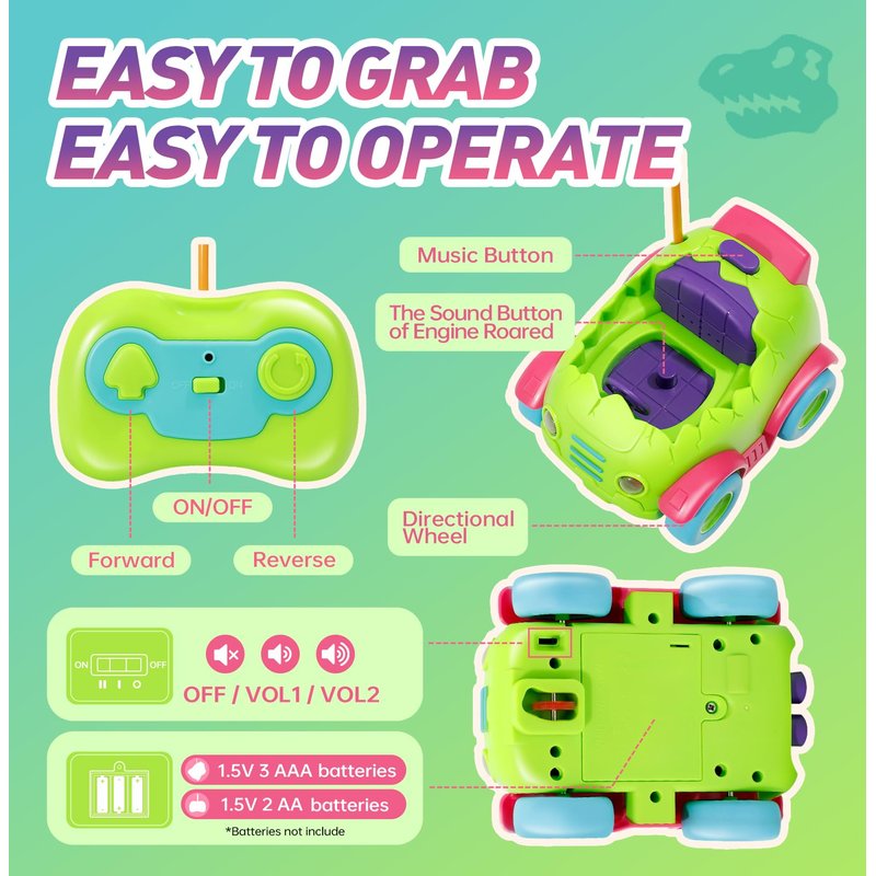 - 🚗Remote Control Cars : Remote control cars for toddlers with music, and light features, two interchangeable dinosaur figures, and two remote controls that move the cars forward and backward left, Dinosaur remote car requires 3AA batteries (not included) and remote controller requires 2 AA batteries (not included)