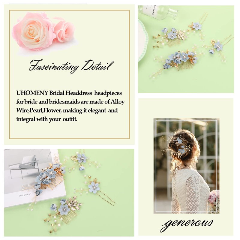 UHOMENY 4PCS Wedding Hair Pins, Bridesmaid Pearl Hair Side Combs Set or Women Girls Feature: 1.Fashion design, Eye-catching,high quality! 2. Wonderful gift for a lover girl friends and yourself! 3.Embellished with pearls and rhinestones, like flowers, it is more beautiful and charming. 4. Wedding Hair Pins For Women And Girls On Wedding, Party And Evening 5. Bridal hair accessories are handmade and you can change the shape easily 6. Suitable for all kinds of women's clothing, such as slip dresses, off-shoulder dresses, etc. Product details Material: Pearl, fabric, alloy Style: Wedding Hair Pins / Hair Side Combs Set Length:5 cm approx. Width:6 cm approx. (excluding comb teeth) What You Get: 4 x Hairpin clips Note: 1. There is 2-3cm difference according to manual measurement, please check the measurement chart carefully before you buy the item. 2. Please note that slight color difference due to the light and screen.