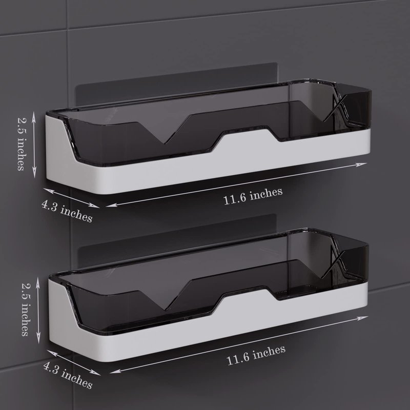 - The Shower Shelf is wide enough(11.6L*4.3W*2.5D Inch) to hold bottles with pumps, shampoo ,conditioner and razors, equipped with 2 adjustable hooks to hang things. Extra storage in your shower.