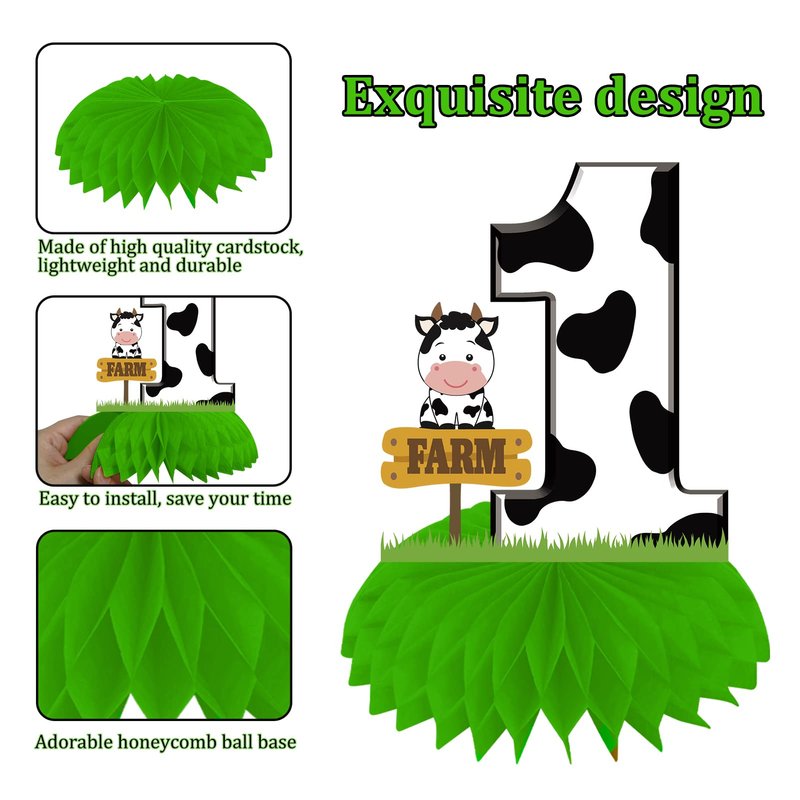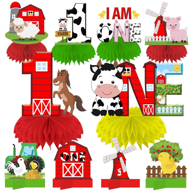 - [You will get] - 10pcs farm animals theme 1st birthday party table centerpieces decorations, including 10 pieces of cardboard with patterns, 6 pieces of honeycomb base (red, green, yellow), 4 pieces of cross base (red, green), enough to decorate your party.