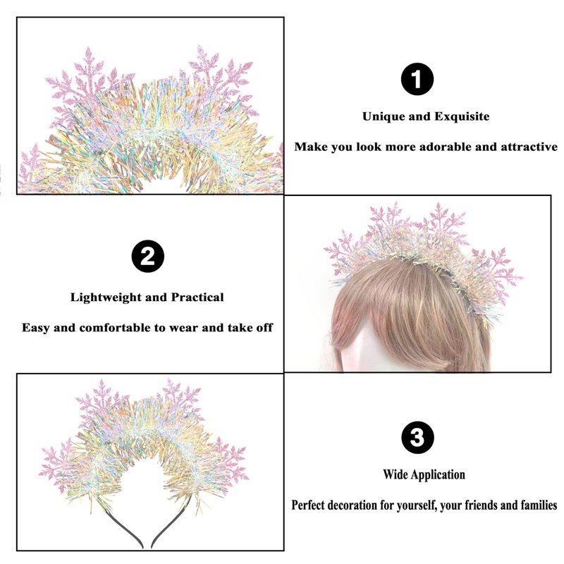 - [Adorable Christmas Outfit] This Christmas snowflake headband is unique and exquisite. Four shiny pink snowflake patterns are attached to the headband with glitter ribbon, and its sparkle can be seen from different angles, which will make you look more adorable and attractive