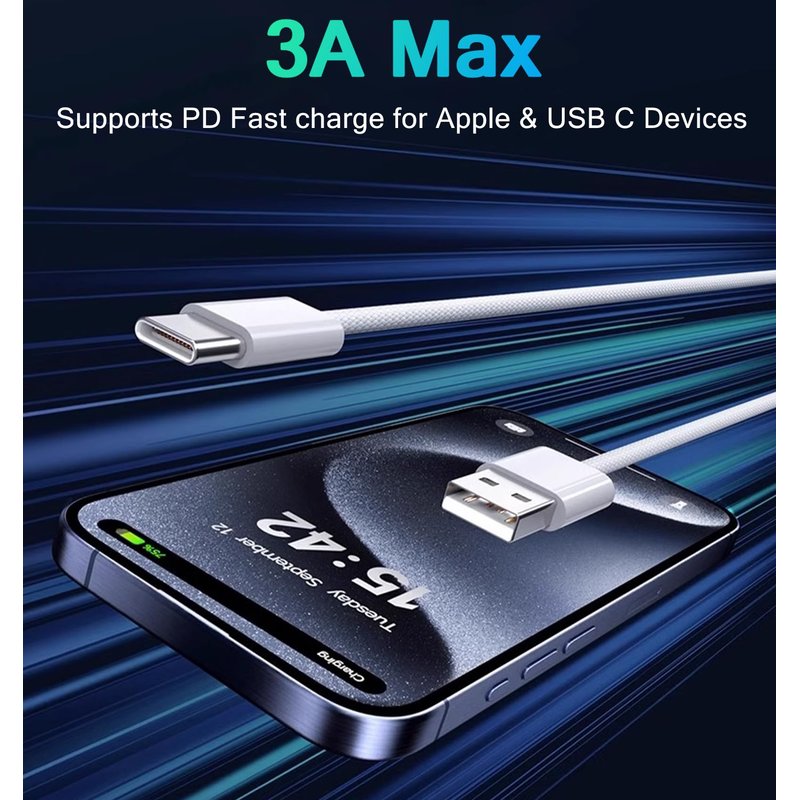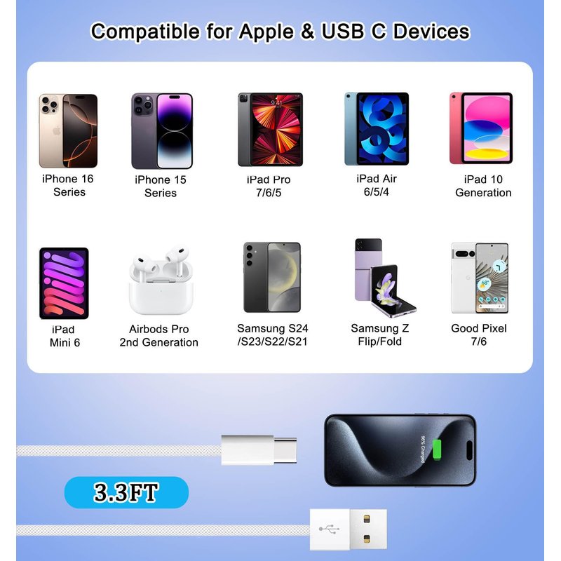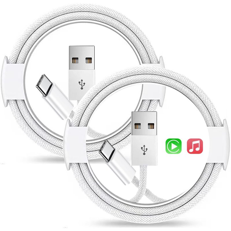 - 【IN THE BOX】: 2 x 3.3ft USB C to USB A Charging woven Cable(White), Support carplay, charing in car.