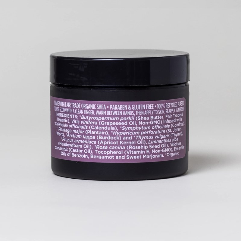 - Shea Butter, (organic and Fair Trade) , Italian Grapeseed Oil (Non-Gmo) Infused With Organic Calendula, *Comfrey, *Plantain, *St. John’s Wort, *Burdock And *Thyme, *Apricot Kernel Oil, Meadowfoam Oil, *Rosehip Seed Oil, *Castor Oil, Vitamin E, Non-GMO and Essential Oils of Benzoin, Bergamot and Sweet Marjoram. (* = organic)