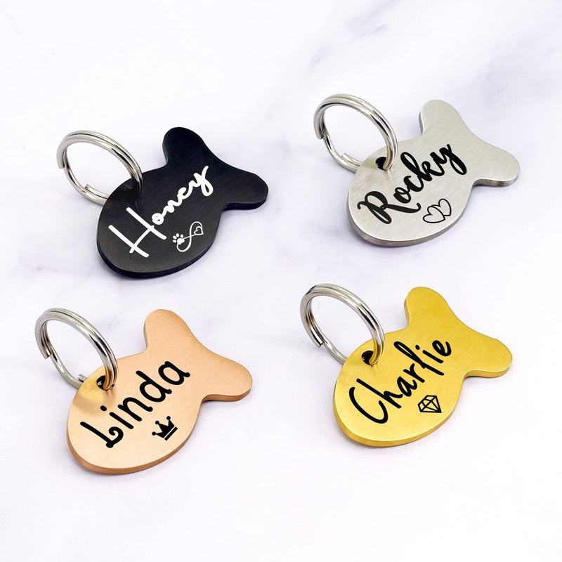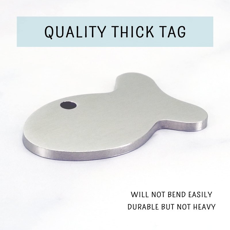 - FISH CAT ID TAG SIZE - This fish shape tag is measured 1.15 inches width with 0.8 inches height, it is designed for pets below 10 lbs or some pets owner who prefered a smaller tag for their pet.