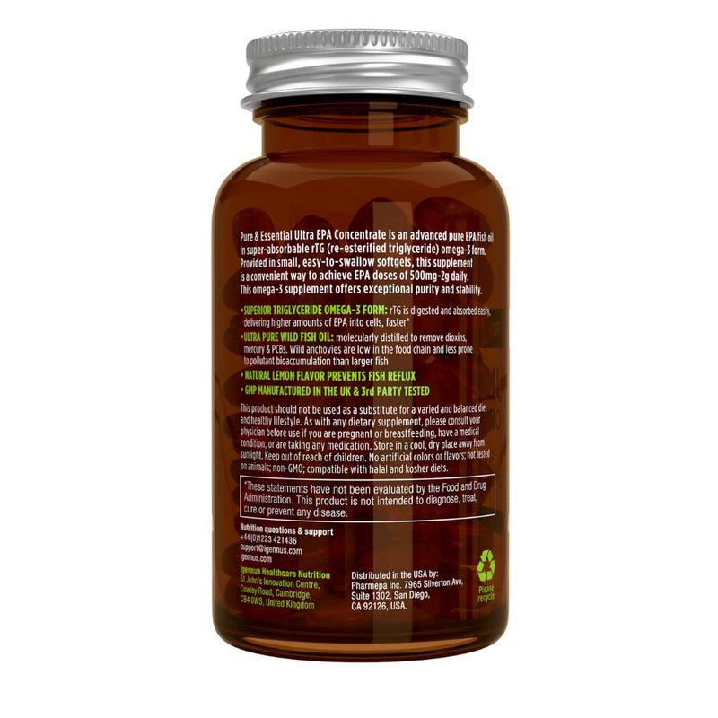 Pure & Essential Ultra EPA Concentrate is a high strength Pure EPA omega-3 fish oil. Each small, easy-to-swallow softgel provides 500mg EPA and this supplement is a convenient way to achieve flexible EPA doses between 500mg-2g daily (we do not recommend exceeding this amount unless under the advice and care of a physician). The omega-3 is provided in the superior rTG form, which is body-ready and delivers higher levels of omega-3 into cells faster than standard fish oil and krill oil. This ultra-pure supplement is sourced from wild, sustainable anchovies and the oil is purified to remove all trace of mercury, dioxins and PCBs.
