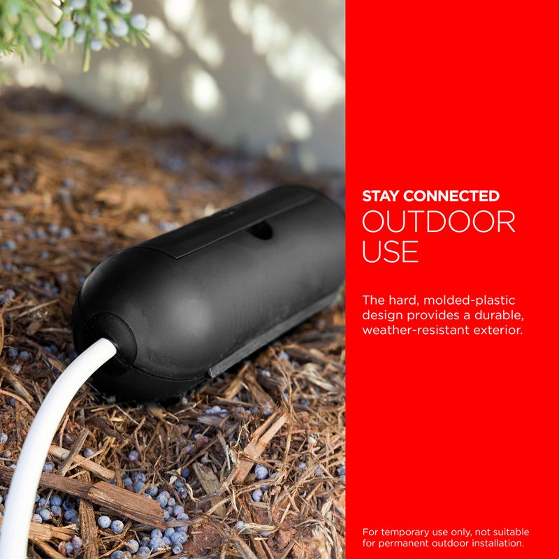 - Outdoor Use – Stay connected, rain or shine! The hard, molded-plastic design provides a durable, weather-resistant exterior (For temporary use only, not suitable for permanent outdoor installation). NOTE: For best performance, use a drip loop. Do not submerge in water.