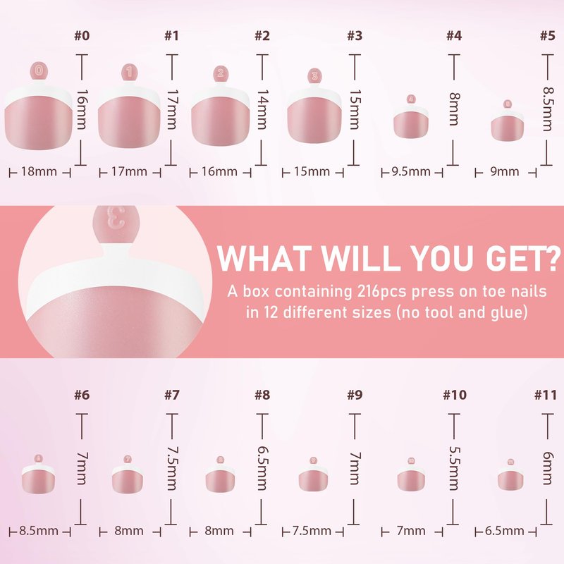 - 💕Convenient and Comprehensive: One box only contains 216 pcs of French short square fake toe nails in 12 different sizes, sufficient for 5-8 perfect French pedicures! Each toenail tip is clearly marked with its size and arranged in a grid layout, allowing you to find the desired size quickly. Additionally, each piece is designed with thoughtful handles for easy pressing during application, making the process more convenient.