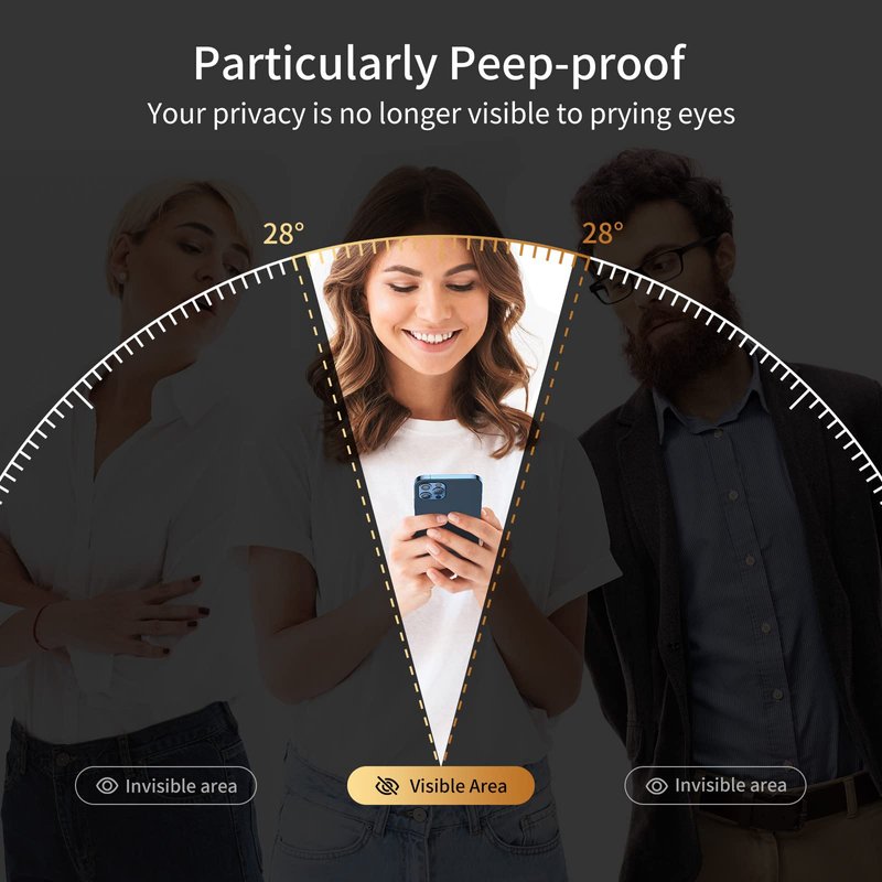 - 【True 28° Anti-spy Protection】- Screen is only directly visible to an immediate user (in front of the screen), effectively protecting your personal privacy from people (28°partial peep-proof, 45°entire peep-proof). Even your friends or colleagues sitting next to you also can't see your messages. Also, a good choice when you are on the bus, elevator, metro, or other public occasions. Protection from the prying eyes of strangers.