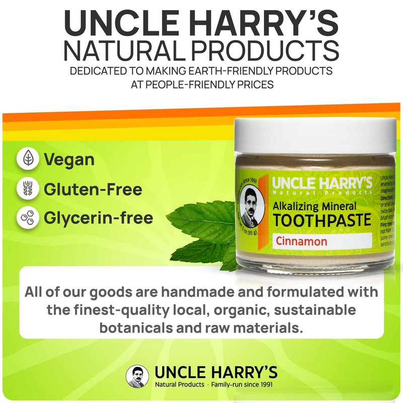 - FRESH BREATH - An all natural toothpaste that eliminates bad breath with warm cinnamon and refreshes your mouth with mineral clays, sea salt, and pure plant essences all day long. Uncle Harry's Natural Tooth Paste Products come packaged in an Earth-friendly, zero waste glass jar that’s been labeled by hand.