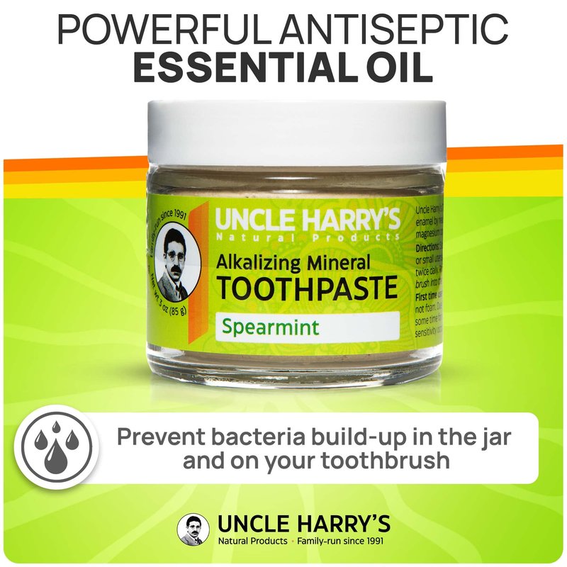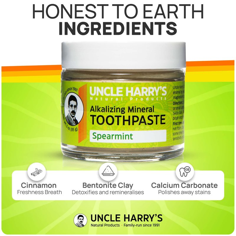 - FRESH BREATH ? An all natural toothpaste that eliminates bad breath with invigorating spearmint and refreshes your mouth with mineral clays, sea salt, and pure plant essences all day long. Uncle Harry's Natural Tooth Paste Products come packaged in an Earth-friendly, zero waste glass jar that’s been labeled by hand.