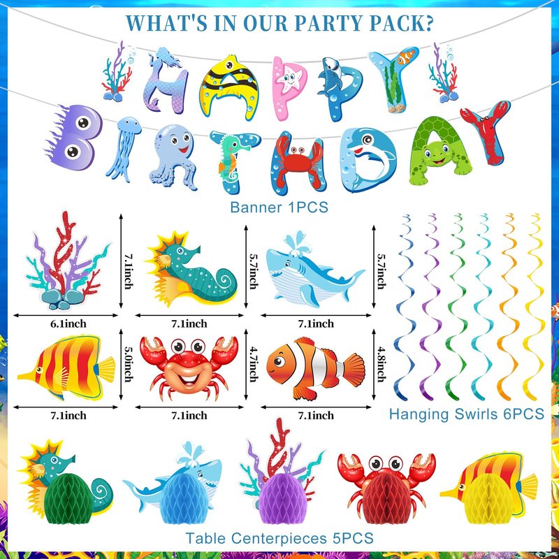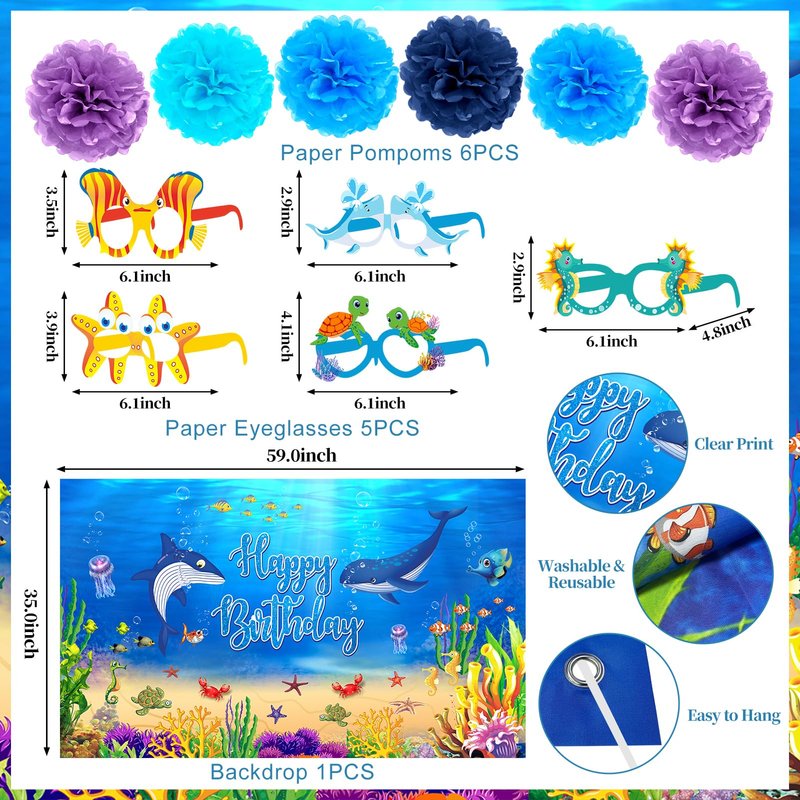 - [Package include] 30 PCS under the sea party decorations kit comes with 1 sea animals HAPPY BIRTHDAY banner, 1 under the sea Happy Birthday backdrop, 5 ocean themed honeycomb centerpieces, 6 sea animals hanging swirls, 5 sea creature paper eyeglasses, 6 paper pomopoms.Dive into a fantastic under the sea party with Uiorgui under the sea party supplies pack