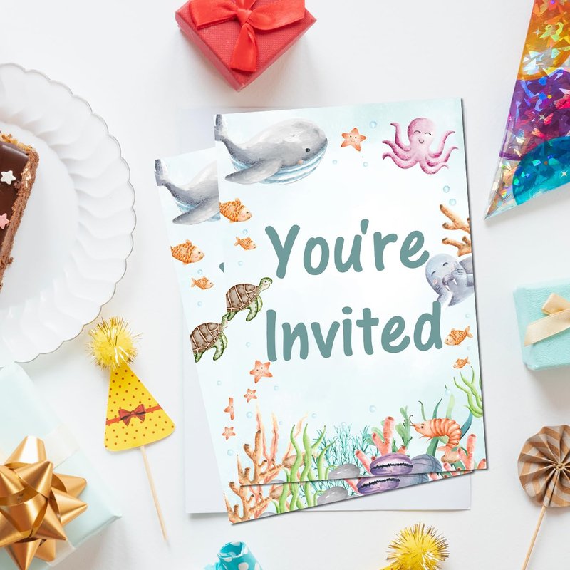 Under the Sea First Birthday Invitations with Envelopes Set of 20 Watercolors Whale Turtle Shark Jellyfish Sea Life 1st Birthday Party Invites Fill in Blank