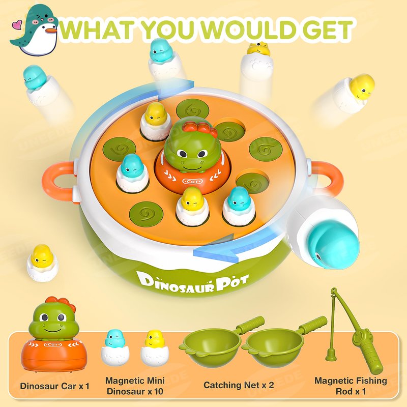 - 【Engaging Hunting and Fishing Games】Kick off the excitement with a dynamic hunting game! Turn on the switch, and the music begins as the turntable spins. Kids can use the catching net to snag bouncing dinosaurs or try fishing for magnetic dinos with the fishing rod. Both games are designed to enhance fine motor skills and focus, making playtime both entertaining and beneficial.