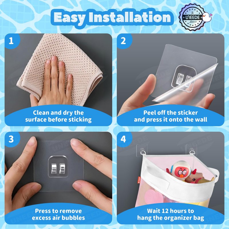 - 【Why We Choose Sticker But Not Suckers】Greater load capacity, longer to use.Unlike suction cups that tend to slip off due to too much humidity, the stickers stay firmly on the wall.It also offers a weight capacity of up to 22 pounds, allowing you to place more toys. For this reason we have prepared a detailed video & photo installation tutorial. It is convenient for you guys to be able to install the organizer in the exact location.
